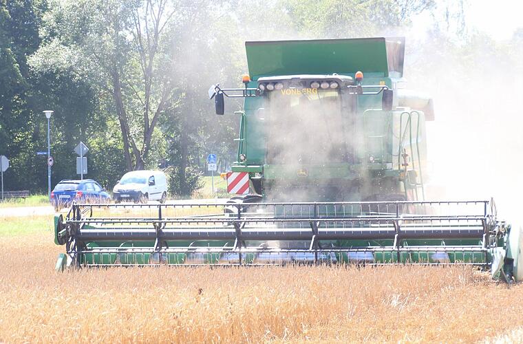 In der dichten Staubwolke ist der Mähdrescher fast nicht zu erkennen. Foto: Friedwald Schedel