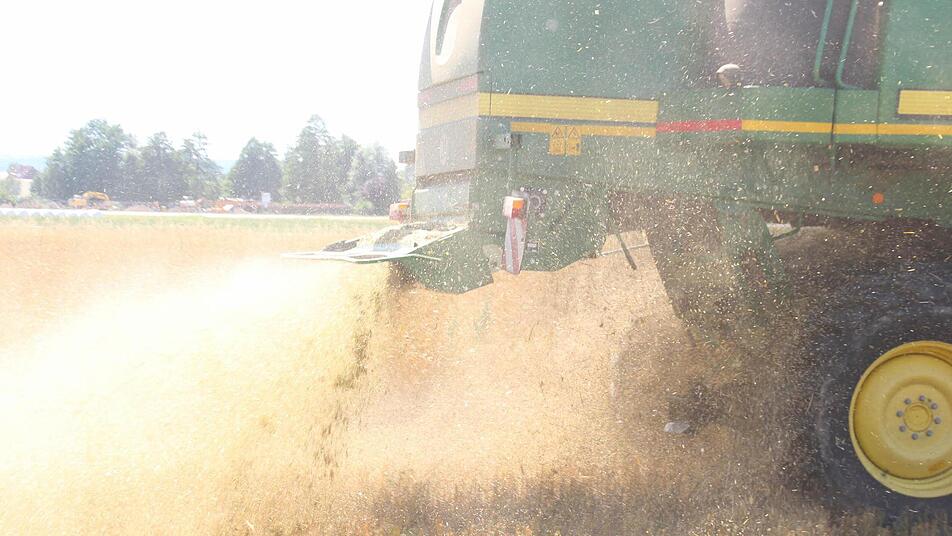 Udo Vonberg beherrscht seinen Mähdrescher wie im Schlaf, steuert die 375 PS starke Maschine mit hoher Geschwindigkeit über das Weizenfeld in Fröschbrunn. Weil das Mähwerk 7,80 Meter breit ist, dauert das Ernten weniger als eine Stunde. Und Vonberg kommt auch bei den tropischen Temperaturen nicht ins Schwitzen, denn die Klimaanlage in der Glaskanzel spuckt ordentlich kalte Luft aus.