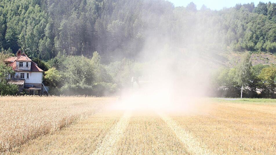 Der Mähdrescher zieht bei Dörfles eine riesige Staubwolke hinter sich her. Foto: Friedwald Schedel