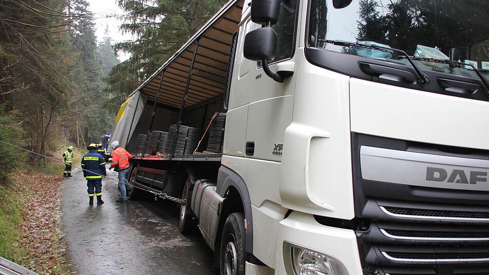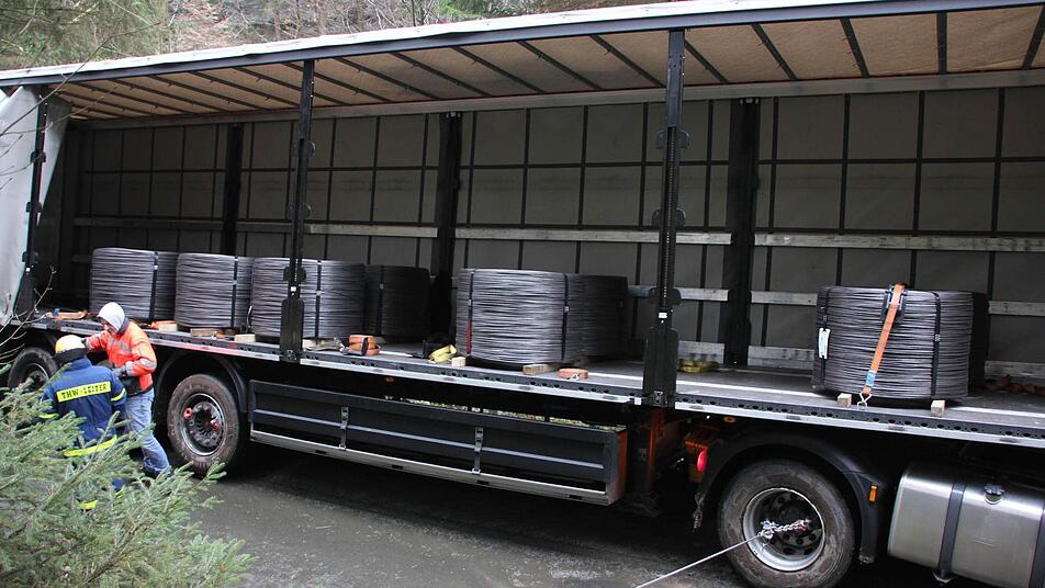 Erneut hat sich ein Laster in der engen und kurvenreichen Tiefenbachstraße bei Steinberg festgefahren. Der mit etlichen Tonnen aufgerollter Stahlbänder beladene rumänische Sattelschlepper drohte umzustürzen. Eine zeit- und personalaufwendige Bergung durch das THW Kronach und Kulmbach sowie die Feuerwehren aus Steinberg, Wilhelmsthal und Wallenfels und eine auf Laster-Bergung spezialisierte Firma aus Buchbach war am Dienstag die Folge der Havarie.