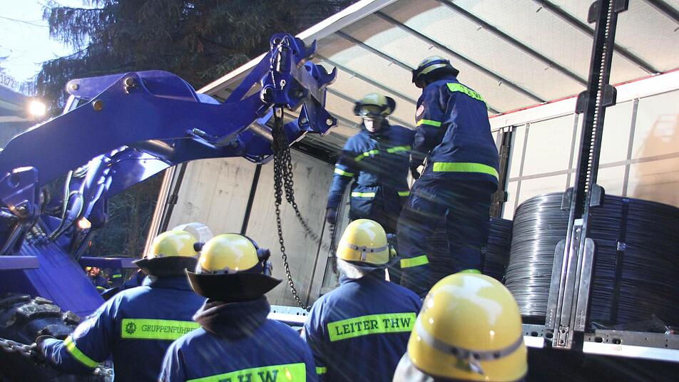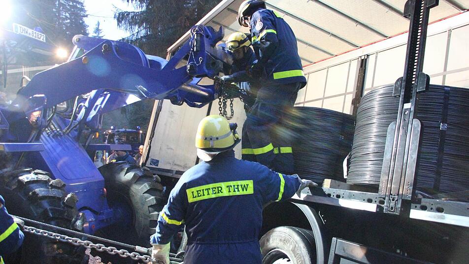 Nachdem dies erledigt war, trat die Ortsgruppe Kulmbach des Technischen Hilfswerks erneut in Aktion. Ein Radlader mit Knicklenkung, mit dem man auch auf engstem Raum manövrieren kann, wurde mit einem Tieflader nach Steinberg geschafft. Mit dem Radlader hoben die rund 30 Einsatzkräfte des Kulmbacher THW die schweren Stahlbandrollen von der Ladefläche. Das war schwieriger als gedacht. Die Rollen auf der rechten Seite wurden mit Hilfe von Ketten angehoben. An die Rollen auf der linken Seite der Ladefläche kam der Radlader jedoch nicht. Also zog man die Rollen mittels Seilwinde eines THW-Lasters und an einem Baum befestigter Umlenkrolle auf die rechte Seite der Ladefläche.