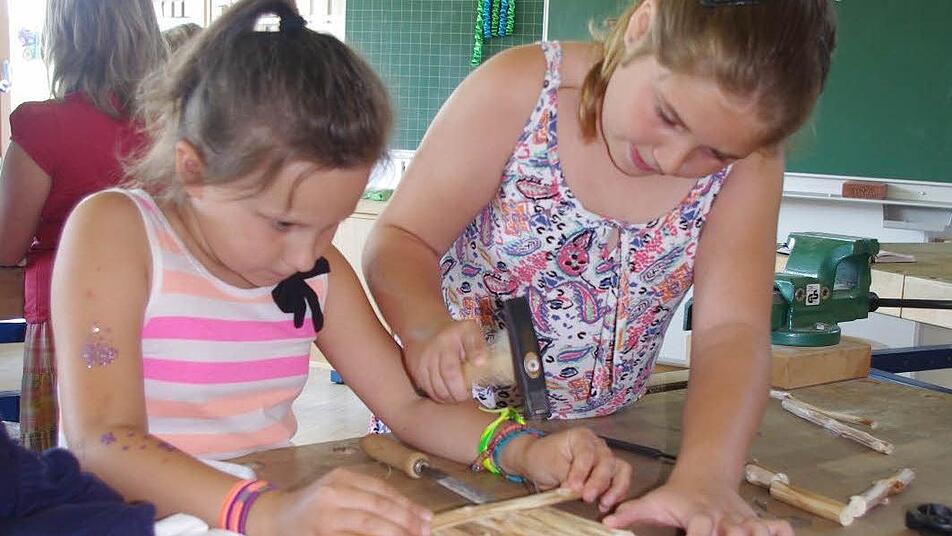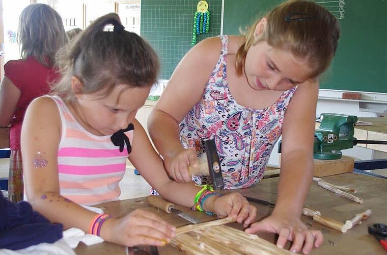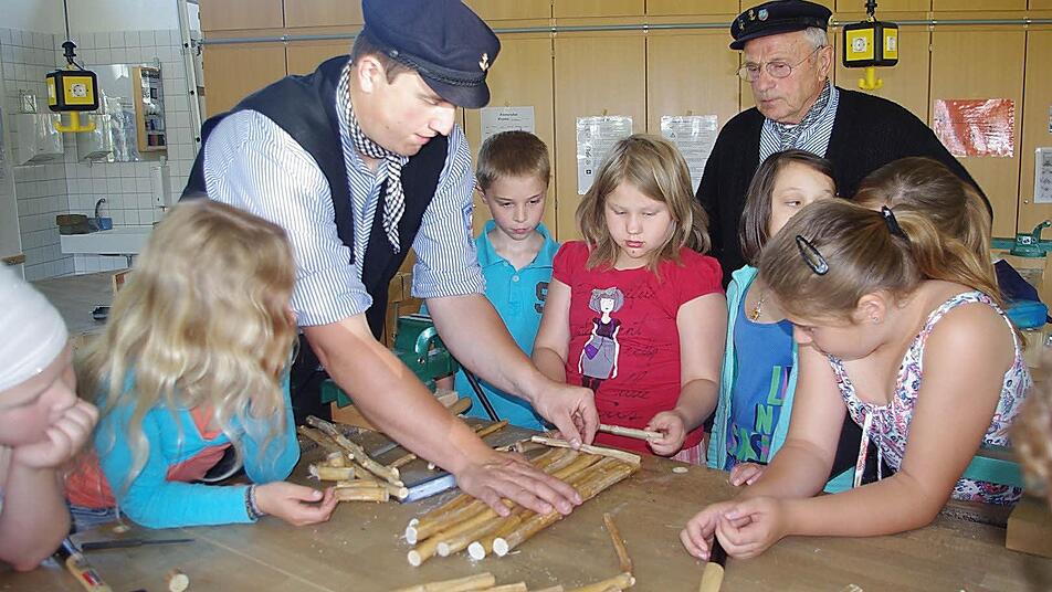 Kristin sägt wie ein Weltmeister. Die Neunjährige hat einen kleinen Ast aus geschältem Haselnussholz in einen Schraubstock eingespannt. Mit einer kleinen Handsäge nimmt sie die Enden ab. Ihre Klassenkameradin Hannah hält das Holz mit einer Hand fest, damit es auch wirklich nicht verrutschen kann. "Das hier ist der König. Er ist am dicksten von den Stämmen. Er muss in die Mitte des Floßes. Die dünneren Stämme müssen rechts und links daneben. Das ist wegen der Stabilität", erklären die Mädchen fachmännisch.
