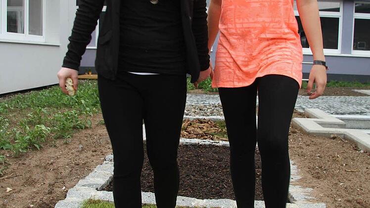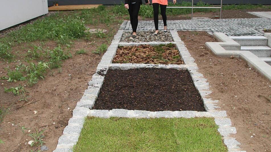 Eine Wucht sind auch die Außenanlagen. Denn statt des üblichen Spielplatzes haben die Montessori-Verantwortlichen einen Mikadowald aus Stämmen anlegen lassen. Der wird in den nächsten Tagen noch mit Kletternetzen ausgestattet. Außerdem gibt es einen Sinnesgarten mit verschiedenen Materialien und ein Kneipp-Becken. Und die Terrasse ist wie eine Hotelterrasse gestaltet - mit viel Sitzmöglichkeiten, mit Sitzsäcken.