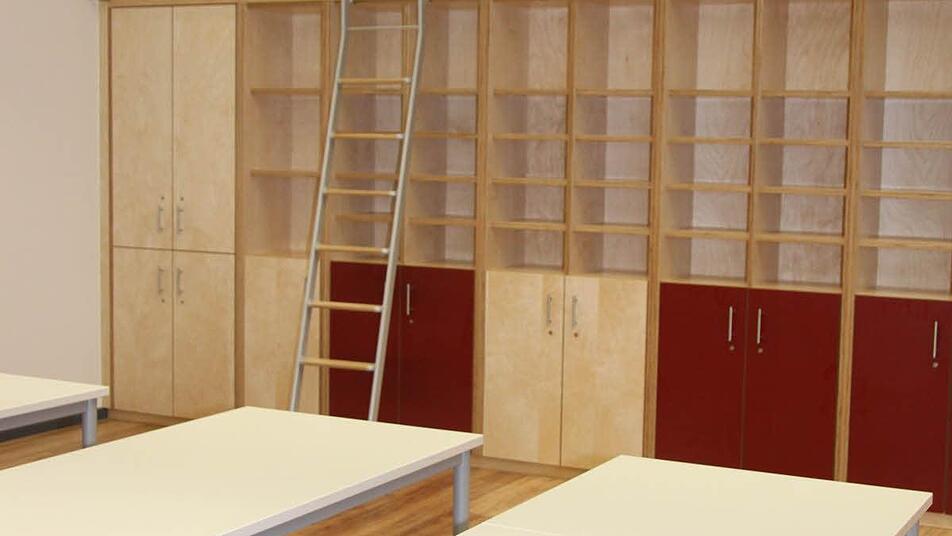 Doch auch das Obergeschoss des Neubaus hat einiges zu bieten: Dort gibt es Räume für die Nachmittagsbetreuung, für die Grundschüler. Außerdem zeigen die Schüler einen Materialraum, eine Bücherei.