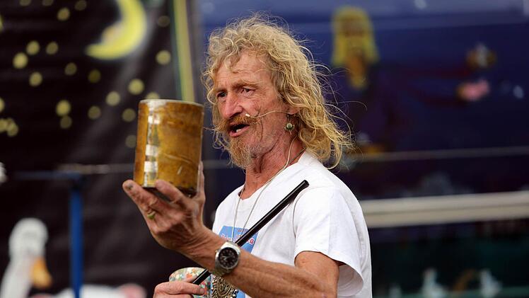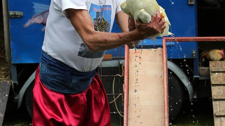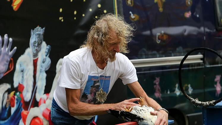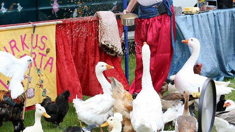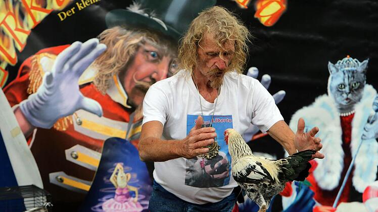 Bereits zum dritten Mal ist er mit seinen Haus- und Hoftieren beim Rosen- und Gartenfestival zu Gast. Der urige Zirkusdirektor aus dem Allgäu schätzt das Flair und das Team auf der Festung Rosenberg ebenso wie die Veranstalter ihn und seine geflügelten oder vierbeinigen "Angestellten". "Es ist sehr schön hier. Ich spiele öfters bei Gartenschauen, aber diese hier ist super", stellt er fest. Kaum ist seine erste Show vorbei, kommt auch schon ein Mitglied des Organisationsteams, fragt ihn, ob er irgendetwas braucht. Bei vielen anderen Veranstaltungen gebe es so etwas nicht, staunt Schetz. Da gehe es den Ausrichtern nur darum, Umsatz zu machen. In Kronach sei alles viel familiärer.