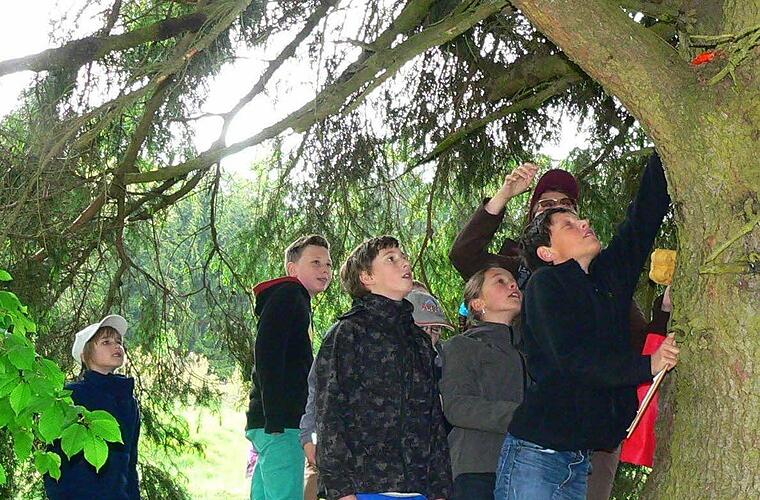 Junge Familien machen mit Vor allem junge Familien nutzten den regenfreien Tag, um von der Nordwaldhalle aus ein zunächst unbekanntes Ziel anzusteuern. Zu Beginn zeigten Obmann Michael Wolf und Wanderwart Michael Köstner den Jüngsten, wie ein GPS-Gerät funktioniert und wie man damit bestimmte Punkte in der Gegend findet. So ging es von Station zu Station, wo verschiedene Aufgaben auf die Wanderer warteten. Verstecke mussten gefunden werden, in denen Naschereien als Belohnungen warteten. Aber auch Gegenstände, die nicht in die Umgebung gehörten, waren auszumachen. "Was ist das für ein Baum? Und was wächst darauf?", lauteten zwei der Fragen, die es am alten Weißdorn zu beantworten galt.