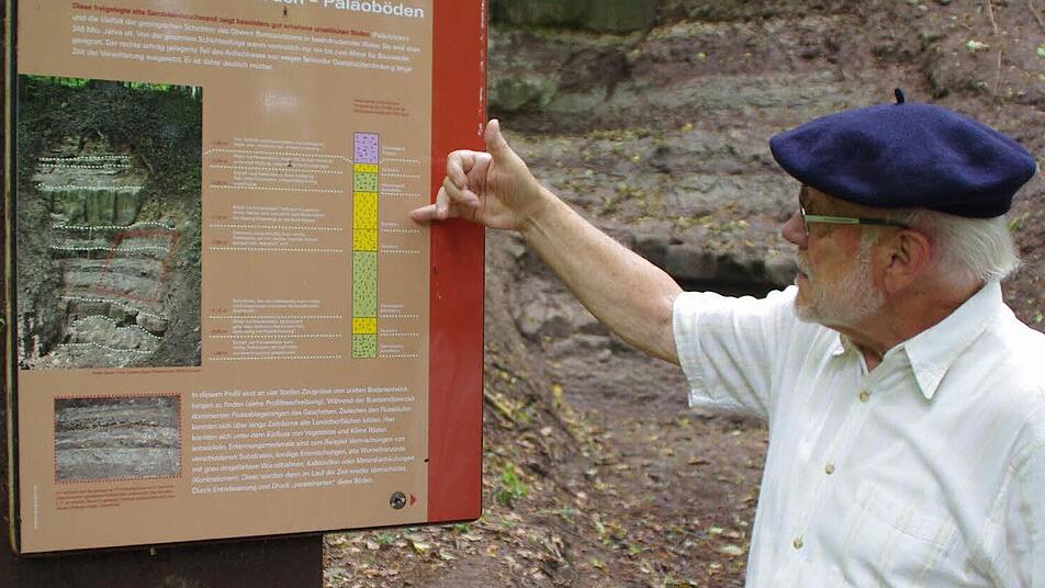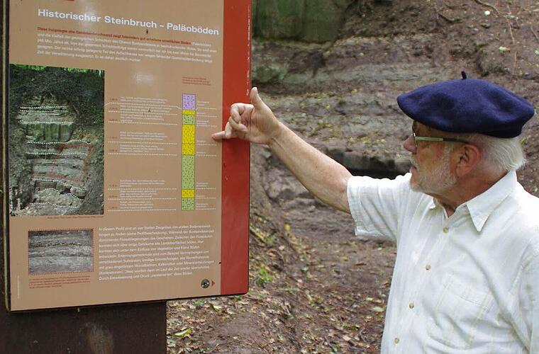 Wie vielschichtig es unter der Erde bei der Festung zugeht, zeigt der Heimatkundler auf einer Schautafel. Direkt dahinter ist ein Ausschnitt des Gesteins bei einem historischen Steinbruch freigelegt. Dort werden die unterschiedlichen Schichten offenbart: ein Sammelsurium aus rötlichen, grauen und bräunlichen Farbstreifen.