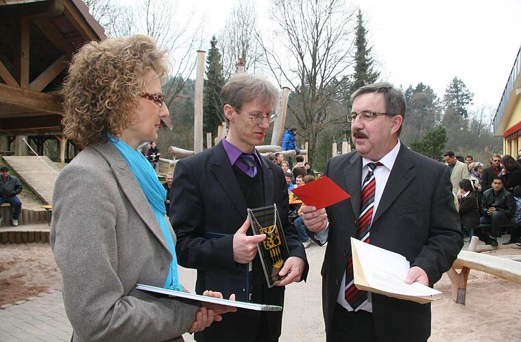 Wappen überreicht Zur offiziellen Einweihungsfeier überreichte stellvertretender Bürgermeister Jürgen Kern Kindergartenleiterin Tanja Schubert und Pfarrer Burkhard Sachs das Gemeindewappen.
