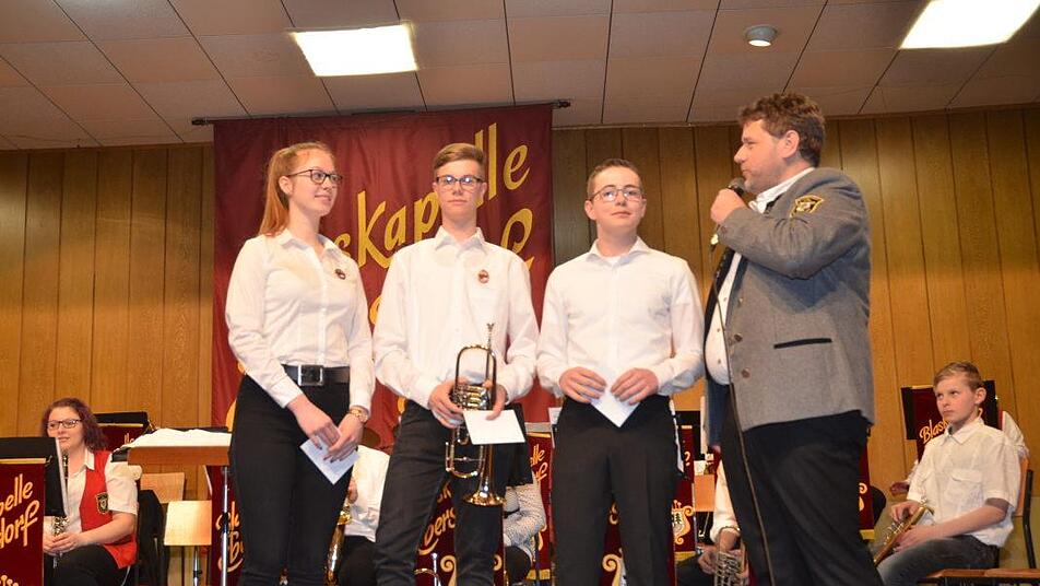 Mit dem Einakter, "Musikprobe ist um halb acht" entlockten die Mitwirkenden den Besuchern etliche Lachsalven und setzten die von Blaskapelle und GV stimulierte gute Laune fort. Die Darsteller: Willi Rentsch, Benjamin Rentsch, Laura Bergthal, Lena Söllner, Leonie Schinner, Eva Söllner. Auch sie ernteten tosenden Beifall für ihre schauspielerische Begabung mit der sie mit sehr viel Humor in die Tücken einer Musikprobe einführten. Das Orchesterkonzert gibt es seit 1950. Damals wurde es erstmals vom Gesangverein initiiert und mit einem Theaterstück umrahmt. Seit geraumer Zeit gestaltet die Blaskapelle dieses zur Tradition gewordene Osterkonzert mit. eh