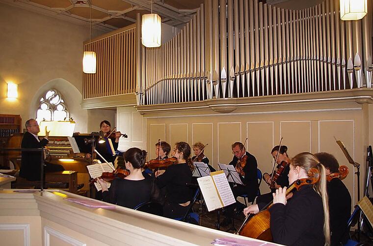 Den grandiosen Abschluss des Konzerts bildete Joseph Haydns vermutlich 1767 entstandenes Konzert C-Dur für Orgel, Streicher und Basso Continuo mit dem Dekanatskantor an der Orgel. Das wundervolle Zusammenspiel zwischen Orgelpositiv und Orchester war und ein Hörerlebnis, wie man es nicht oft zu hören bekommt.
