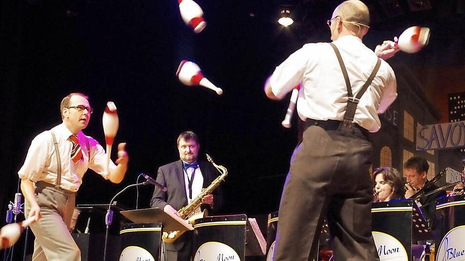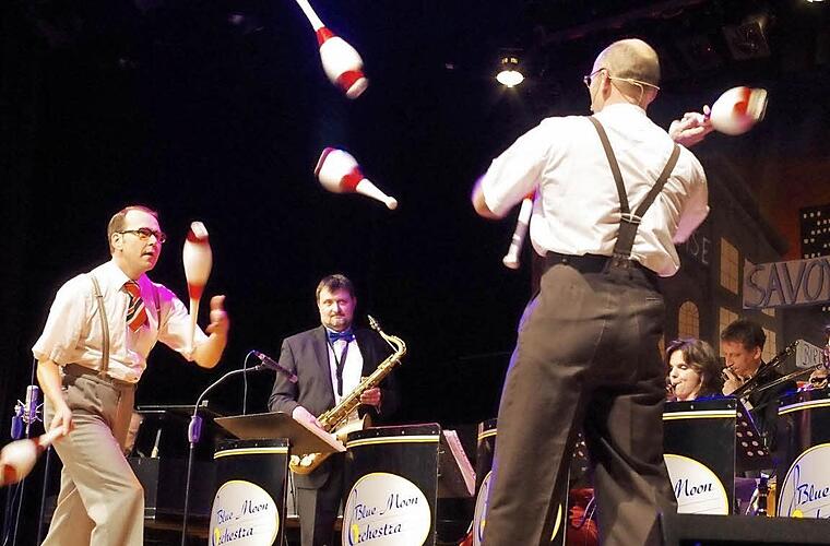 Das war so romantisch, dass Stan und Oli - alias Matthias Shortmann und Lothar Beyerlorzer - rote Herzen in die Luft hielten. Die beiden "Maskottchen" des "Blue Moon Orchestra" durften beim Jubiläum natürlich ebenfalls nicht fehlen. Und dann gab es auch noch "etwas andere" Gäste, die das Publikum vor Lachen außer "Rand und Band" brachten - nämlich das geniale Comedy-Duo "Ebel und Mai", das ein herrliches Potpourri aus Slapstick, Pantomime und Artistik bot: ob bei ihrem Keulen-Strip, mit dem sie Wettkönig bei "Wetten dass" geworden waren, oder beim Versuch, Stefan aus dem Publikum mit ihren Keulen die Zigarette aus dem Mund zu werfen.