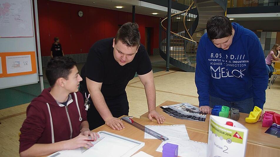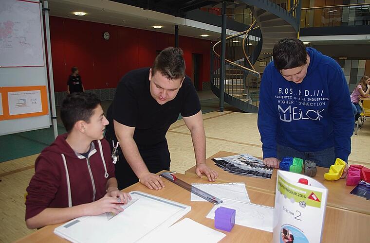 Ihm gegenüber sitzt Kevin, der die entgegengesetzte Aufgabe löst. Er zeichnet die Projektion eines Körpers, wie er sich aus der jeweiligen Beobachtungsrichtung zeigt. Die beiden 15-Jährigen haben das Prinzip im Nu verstanden und meistern ihre Aufgaben mit Bravour. Ihr ein Jahr älterer Klassenkamerad Adrian versucht indes, einen in sechs Teile zerteilten Ball aus geschäumten Kunststoff wieder zusammenzusetzen - eine knifflige Angelegenheit.