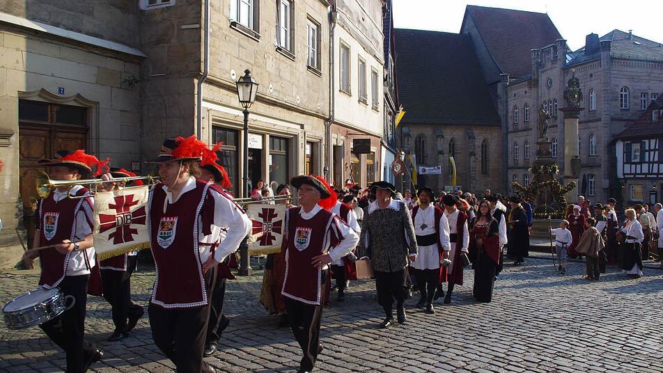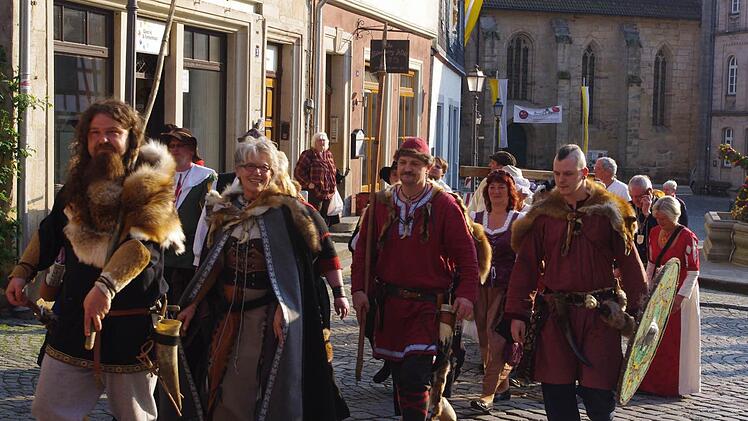 Dann aber konnte es losgehen: Die Fanfaren des Spielmannszuges Nordhalben erklangen, und unter seiner musikalischen Begleitung setzte sich der Zug vom Melchior-Otto-Platz aus mit den Teilnehmern aus der historischen Szene Kronachs in Bewegung. Der Zug führte über die Lucas-Cranach-Straße und die Amtsgerichtsstraße bis zur Historischen Markthalle. Ein Zwischenstopp wurde beim Kunigunden-Maß-Ehrenmal eingelegt.