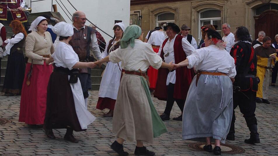 Vor der alten Markthalle erfreuten - nach dem Salut der Kronacher Ausschüsser - die "Croniche Tanzleut" mit Tanzeinlagen. Unter Fanfarenklängen zog man in die Markthalle ein. Stadtherrin Angela Hofmann bot dabei in ihrem historischen Gewand inmitten ihrer männlichen Untertanen einen schönen Anblick.