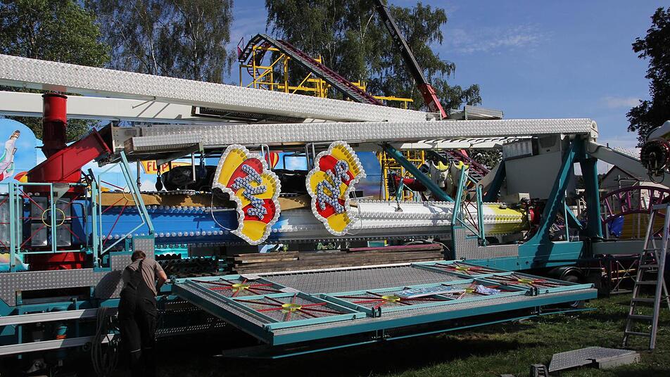 Es ist Montagmittag - und es ist fast geschafft. Wo am Tag zuvor noch Hunderte Festgäste vom "Flip Fly" in die Luft geschleudert wurden, ist nun nur noch ein Anhänger mit etwas Deko und der Rückwand des Fahrgeschäfts zu sehen. "Das Meiste ist im Fahrzeug integriert. Das ist die neueste Technik", freut sich Thomas Clauß, dass er beim Abbau auf dem Freischießen spürbar weniger Aufwand hat als früher mit anderen Attraktionen. Dennoch ist es für ihn und seine drei Mitarbeiter ein Knochenjob, in acht Stunden alles für die Abfahrt vorzubereiten.