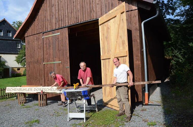 Die Hauptinitiatoren für einen Wiederaufbau der Dorfscheune, Robert Wagner (Erster Vorsitzender der Wehr), Werner Murrmann (Kommandant) und Thomas Schamberger (Kassier), legten in einen Arbeitseinsatz letzte Hand an, um die Dorfscheune auch von Außen schön zu machen.