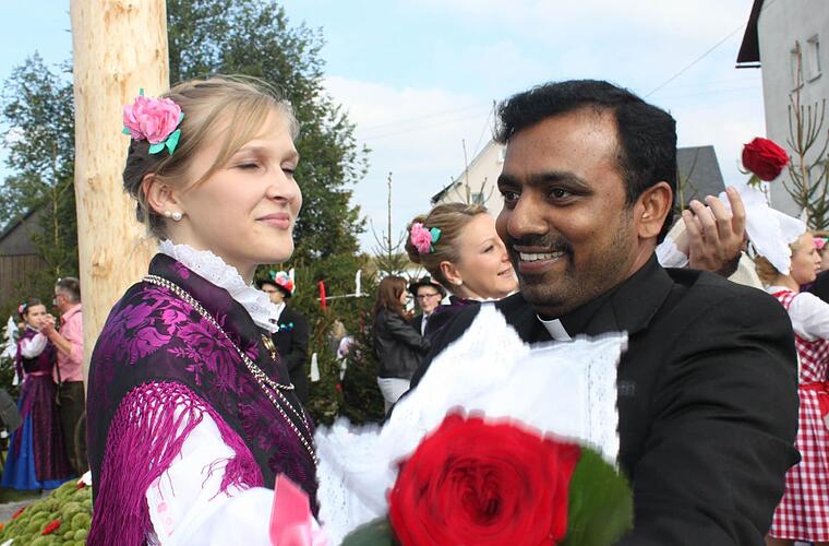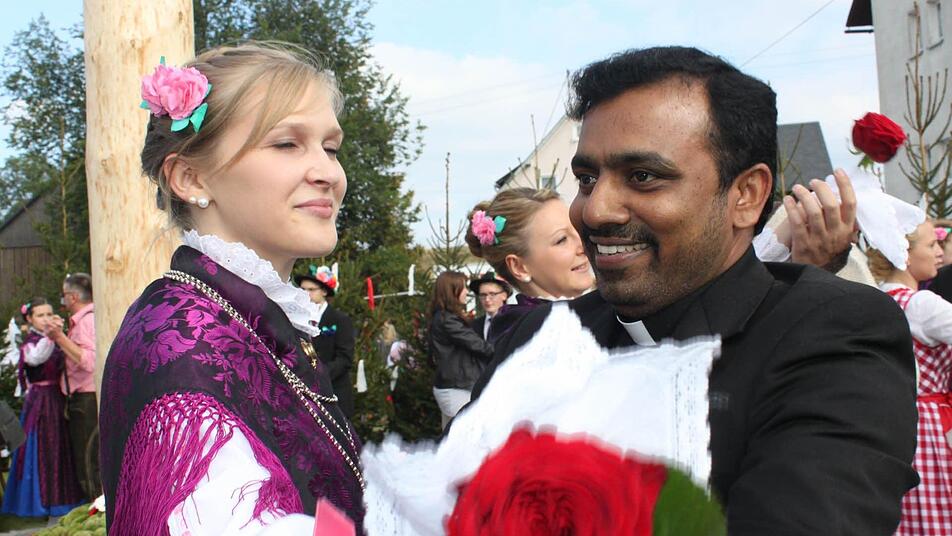 Die Trachtenkirchweih in Hirschfeld ist mit viel Arbeit und Tradition verbunden. In diesem Jahr war aber auch ein Novum dabei. Denn der neue Pfarrer Cyriac Chittukalam hielt zum ersten Mal in der Gemeinde einen Gottesdienst. Und er wurde gleich ins Brauchtum mit eingeführt.