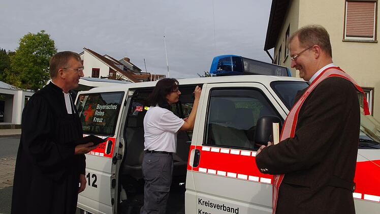 Regionaldekan Thomas Teuchgräber und Pfarrer Gerald Munzert erbaten den Segen Gottes für das Fahrzeug. "Wir segnen nicht so sehr das Material, sondern vor allem die Menschen, die es nutzen", so der Regionaldekan.