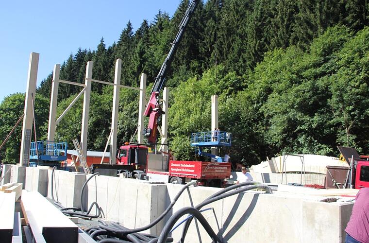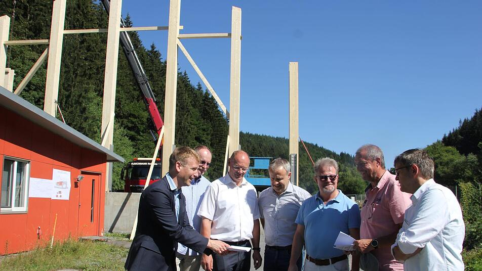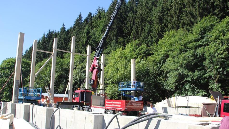 Fährt man derzeit auf der B 85 von Steinbach aus nach Förtschendorf, sticht einem die Baustelle ins Auge. Auf einem Betonsockel sind Holzbalken angebracht. In wenigen Tagen soll die Halle mit Holz verkleidet werden. Nach Vollendung der Baumaßnahme soll in der Halle bis etwa 4,5 Meter hoch das Salz für den Winterdienst gelagert werden.