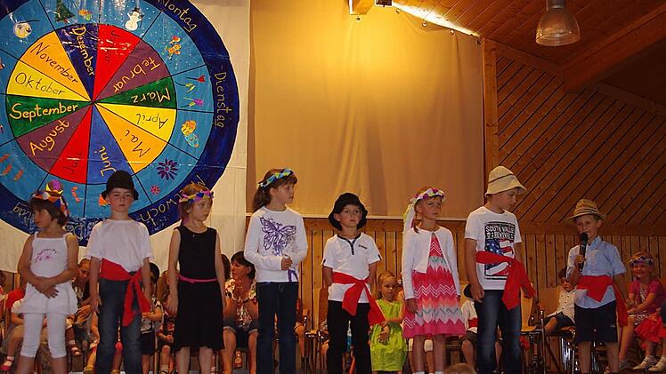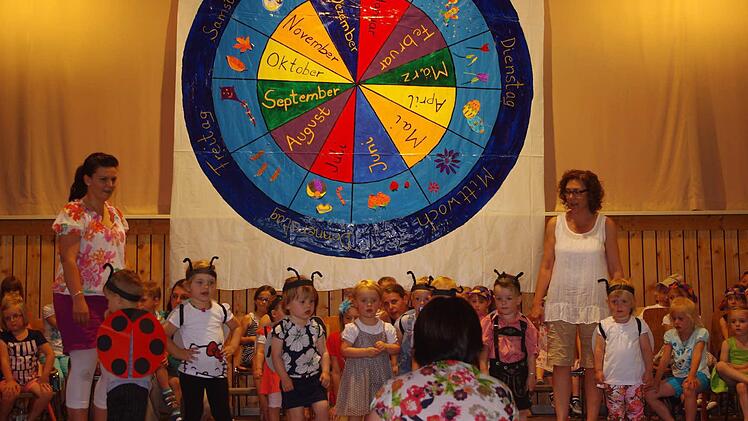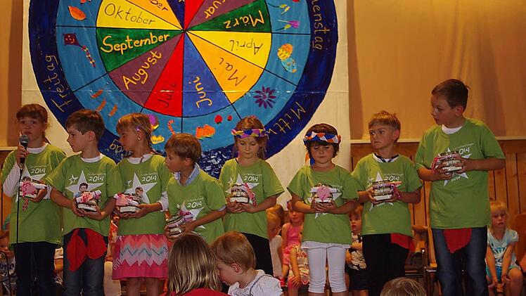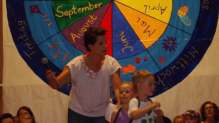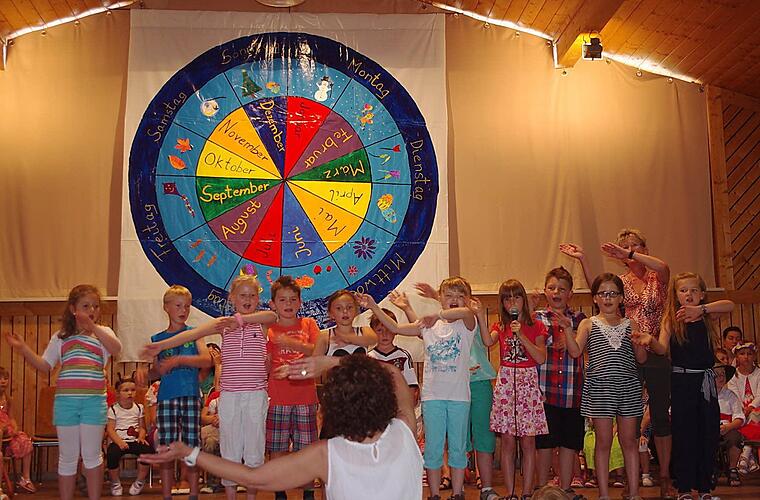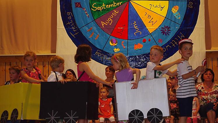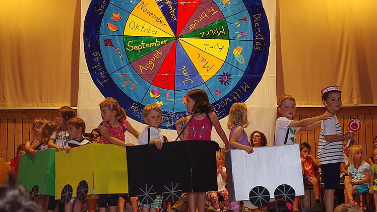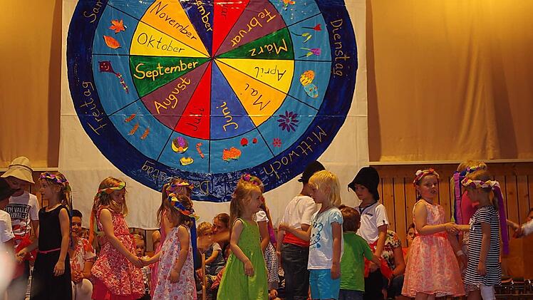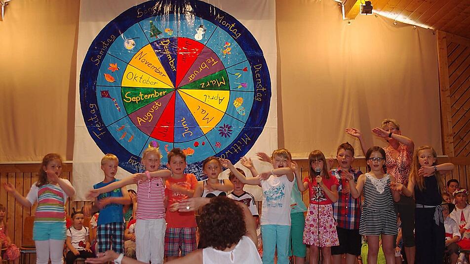 Eine große Jahresuhr prangte über der Bühne im Neufanger Feststoudl. Elternbeirätin Susanne Schubert, die das kleine Kunstwerk entworfen hat, gestaltete die Monate als zwölf farbige "Kuchenstücke". Um sie herum hatte sie die Besonderheiten von Frühling, Sommer, Herbst und Winter aufgemalt. Ganz außen sind die Wochentage Montag bis Sonntag "verewigt": Vor dieser stimmigen Kulisse fand am Sonntag das Sommerfest passend zum Jahresthema "Zeit" statt. Die Jungen und Mädchen der katholischen Kindertagesstätte St. Laurentius Neufang sind auf diesem Gebiet schon kleine Fachmänner und Fachfrauen, hatte sich doch in der Einrichtung vieles um erfahrbare Zeit gedreht.