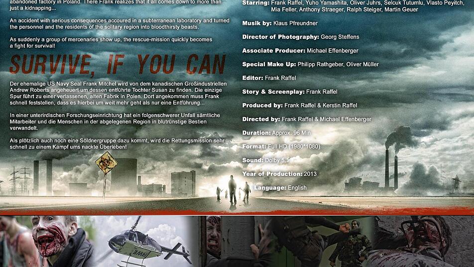 Was zeichnet Ihren Film gegenüber den teuren amerikanischen Produktionen dieses Genres aus?Das Besondere ist die geniale Mischung aus unterschiedlichsten Action-Elementen mit hartem Horror. "Survival" hat Schockmomente, Blut, Splatter-Effekte und Spannung. Dazu kommen noch Action-Bausteine, wie Kampfkunst, Schießszenen oder Flucht- und Auto-Action. In dieser Mischung gibt es das gar nicht. Damit ist "Survival" einzigartig auf dem Markt. Die Story ist zwar nichts Neues, aber die Erzählweise ist komplett anders als gewohnt. Es wird gegen sämtliche Klischees verstoßen oder damit gespielt - eine Achterbahnfahrt der Gefühle. Zu viel will ich aber nicht verraten.
