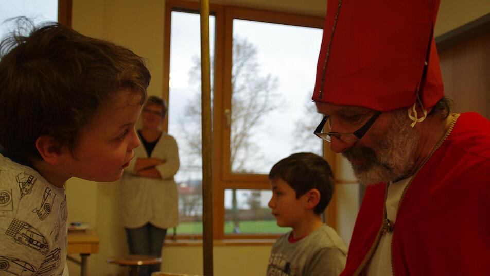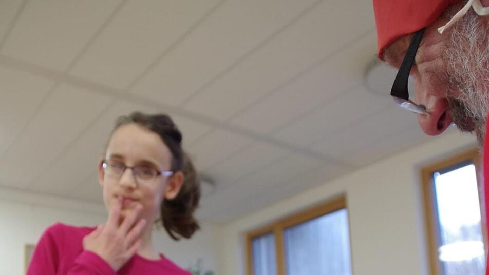 Als Helmut Böhnlein in seinem weißen Gewand mit dem roten Umhang durch die Tür schreitet, herrscht kurz Stille. Die Augen der Kinder werden beim Anblick des bärtigen Mannes immer größer. Doch die Anspannung legt sich schnell. Von Angst keine Spur. Höflich, aber doch keck, wird der Nikolaus mit einem fast schon kumpelhaften Handschlag und einem lockeren "Hallo, Herr Nikolaus!" vom ersten der 15 Kinder begrüßt.