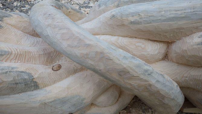 Das liegt einerseits am eindrucksvollen handwerklichen Können, anderseits aber auch an seiner unübersehbaren "Verkabelung". Der Bildhauer zapft nämlich die "Vibes" mittels Antenne aus der Umgebung an, die dann via Kopfhörer auf ihn und seine Hände übergehen. Das funktioniert offensichtlich; zumindest teilweise, denn aus dem etwa 40 Jahre alten Fichtenstamm (gestiftet vom Nordhalbener Staatsforstbetrieb) schält er ein dickes Kabelbündel heraus. "Schlafende Seelen - Stimmen im Holz" soll sein Werk heißen, das noch einiges "Erweckungspotential" bis zur Präsentation hat.
