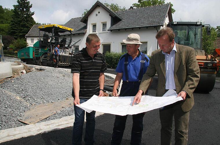 Schon morgens in aller Frühe geht es los: Laster kippen mit lautem Rasseln ihre Steine ab, Asphaltierungsmaschinen sind zugange. Und seit Wochen können die Anwohner der Oberen Dorfstraße 14 bis 29 nicht direkt zu ihren Grundstücken fahren. "Aber die Leute und die Anwohner helfen sich gegenseitig. Wir haben hier alle Verständnis und Geduld", sagt der örtliche Beauftragte der Dorferneuerung, Lothar Weith. In der Praxis sieht das so aus, dass auch mal Nachbarn ihre Grundstücke zum Durchqueren öffnen.