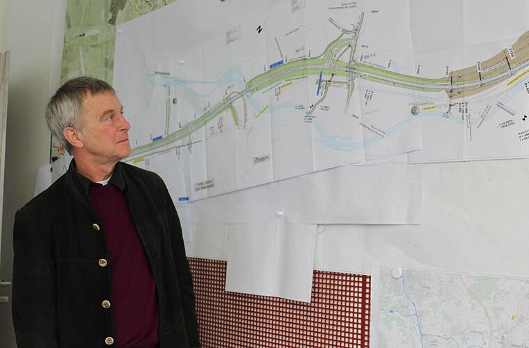 Jürgen Woll vom Staatlichen Bauamt erläutert die Planungen für die Ortsumgehung Zeyern. Er wünscht sich ein baldiges Ende der Querelen, damit die Bürger vom Durchgangsverkehr entlastet werden können.