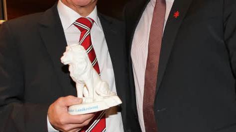 "Du bist nicht als Bettvorleger geendet, sondern als leibhaftiger Löwe."Eckstein bei der Übergabe eines bayerischen Porzellan-Löwen an Marr.