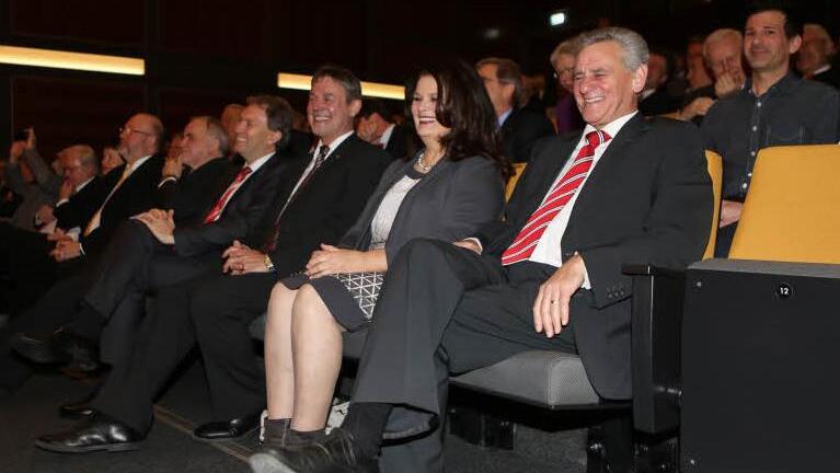 "Der wahre Grund, warum Sie mich hierher eingeladen haben: Sie wollten einen Belastungstest für die erste Stuhlreihe ausführen."Joachim Herrmann auf die Hinweise Gerhard Wunders, dass die Ehrengäste im Kreiskulturraum schon einmal mit ihrer Stuhlreihe "abgekippt" sind.