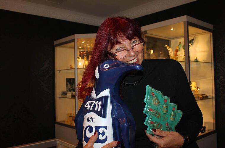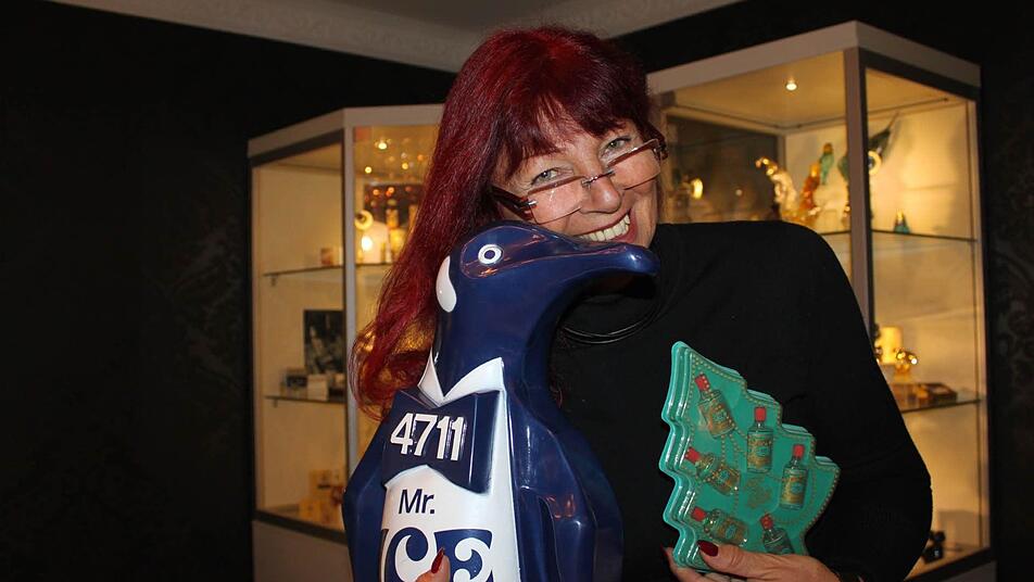 Es ist Freitagmorgen. Ihre Koffer hat Beatrice Frankl noch nicht ausgepackt, aber sie ist voller Elan. Sie zeigt ein Weihnachtsfenster aus Glas. "Das stelle ich jetzt mit aus, passt schließlich zur Jahreszeit!" Sie steht vor Glasvitrinen und überlegt, welche Exponate sie austauscht. Zu sehen sind Flakons, Puderdosen, Duftkarten, limitierte Sonderteile.