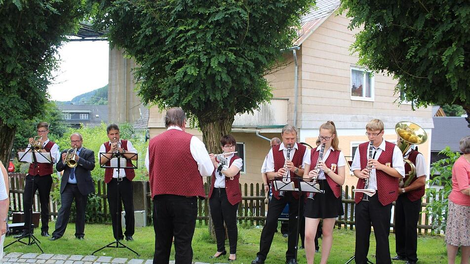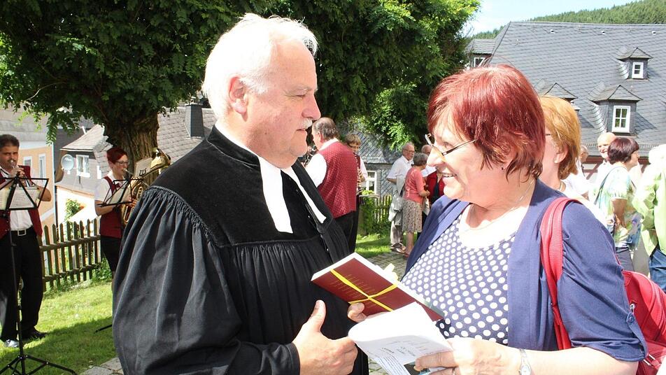 Der Musik nicht genug - draußen im Kirchhof wartete schon die Stadtkapelle mit ein paar Ständchen. Albrecht Bischoff war an diesem Tag ganz in seinem Element, einfach unter Menschen, als er sich mit dankenden Worten verabschiedete. "Als ich damals nach Ludwigsstadt kam, hatte ich den Eindruck, dass die meisten am liebsten alles hingeschmissen hätten", begann er seinen Rückblick.