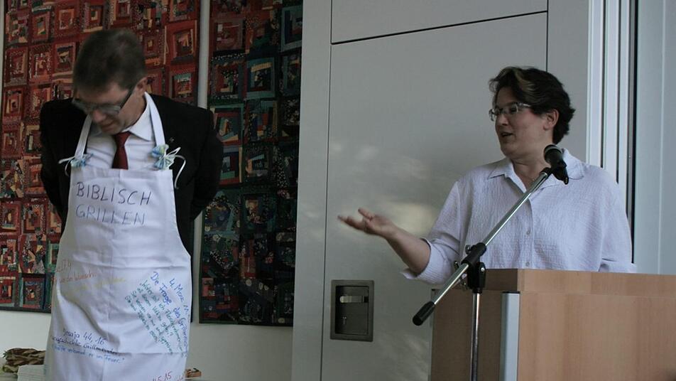 Kirchenvorstand Ulli Oßmann und Susanne Bächer gaben in ihrer Rede einen Rückblick auf das Wirken von Pfarrer Gundermann. Ein umgänglicher Mensch sei er, sportlich aktiv und mit vielen Ideen. Als Abschiedsgeschenk überreichten sie einen Grill, Holzkohle und einen Scheck für Grillgut. "Beim Grillen ist ein Mann noch ein Mann", freute sich der Beschenkte augenzwinkernd. Kurzerhand lud er dann auch alle zum nächsten Gemeindefest im Pfarrgarten nach Bayreuth ein.