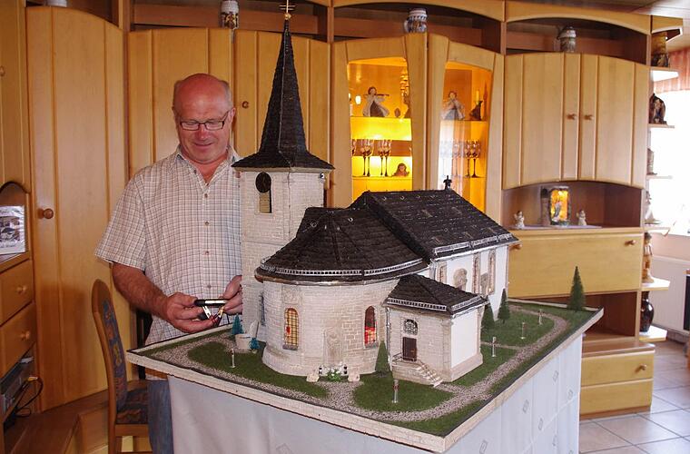 Ludwig Hummel baute das Gotteshaus St. Ägidius im Maßstab 1:38 originalgetreu nach. Das Modell wird der Bevölkerung beim Skapulierfest vorgestellt.