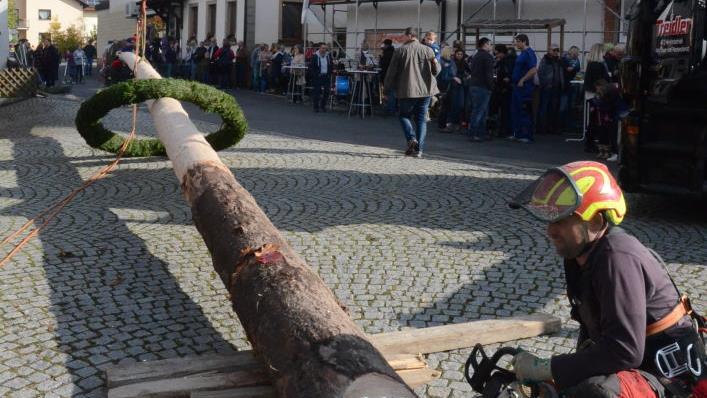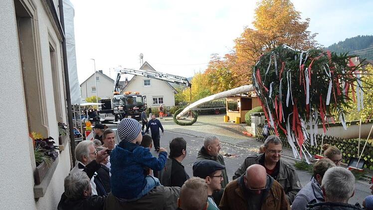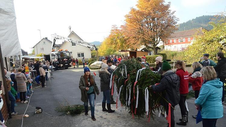 Schon lange vor den eigentlichen Höhepunkten des Kirchweihfestes gab es jede Menge an Vorarbeit zu leisten. Schon vor vier Wochen zogen die Buben hinaus in den Wald, um den 29 Meter hohen Kerwabaum zu fällen. Mit der Handziehsäge wird der Baum in konventioneller Handarbeit gefällt. Am vergangenen Donnerstag erfolgte schließlich der Transport vom Wald von Eugen Rebhan zur Zecherhalle. Der Baum wird traditionsgemäß vom ersten Zecherpaar gespendet. Das sind in diesem Jahr Tobias Rebhan und Theresa Beetz. Am Freitag bearbeiten die Buben den Baum mit Schnitzeisen, während die Mädels mit dem Kranzbinden beschäftigt waren. Ein Spektakel besonderer Art ist die Baumaufstellung am Samstag. Zunächst muss der Riesenstamm auf dem Rückewagen von der Zecherhalle zum Festplatz im Dorf gebracht werden. Hunderte von Schaulustigen beobachteten am Samstag das Spektakel. Mit einem Kran wurde der Baum in die Vertikale gehievt. Dazu wurde der untere Stamm in eine 3,5 Meter tiefe Grube gesetzt, die als Fundament und Halterung dient. Auch Schirmherr Rainer Detsch nahm Anteil an der schweißtreibenden Arbeit der Zechpaare, bevor das Fest überhaupt so richtig in die Gänge kam. Weitere Einhaltpaare sind Thomas Eidloth/Pauline Leubner, Nicklas Hackel/Annalena Nickol, Felix Maurer/Sophia Rubel, Jonas Nickol/Sarah Lang sowie Kevin Schnapp/Lea Schirmer. Die Kellner sind Philipp Wachter, Johannes Fröba und Adrian Milich.