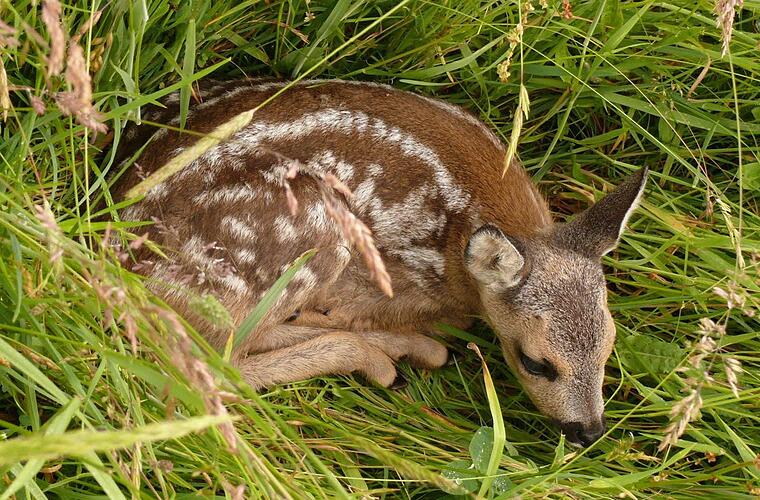 Was vor einem Beutegreifer schützt, bringt den Jungtieren bei einem Mähwerk den Tod. Erst im Alter von zwei bis vier Wochen sind die Kitze fähig, vor ihren Feinden zu flüchten.