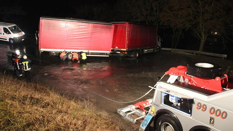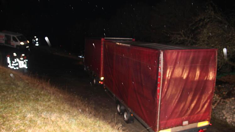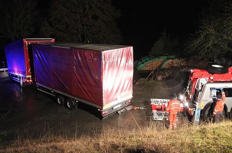 Mit dem schweren Bergegerät und dessen kräftiger Seilwinde gelang es fast mühelos, den Hänger und auch den angekoppelten Maschinenwagen rückwärts und seitlich in die Zufahrt zu einem Anwesen zu ziehen. Dann konnte der Fahrer des Lastzugs Richtung Zeyern zurückfahren.
