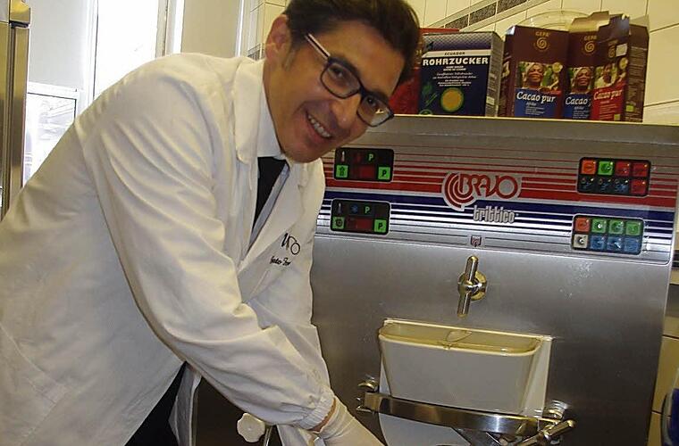 Da läuft einem beim Hinschauen glatt das Wasser im Mund zusammen! Roberto Fontana öffnet die Eismaschine in seiner "Eisküche". In in seinem Eiscafé "Miro" hat er an diesem Mittwochnachmittag verschiedene eiskalte Köstlichkeiten hergestellt, die er in kleine Edelstahlwännchen füllt.