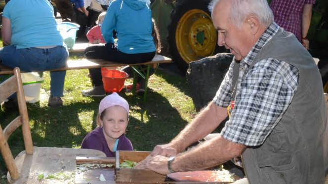 Ab in die Fässer Die Kohlköpfe wurden halbiert und dem Krauthobel zugeführt, an dem Klaus Glatzer eifrig den Weißkohl schnitt. Antonia Fröba von den Naturstrolchen holte den geschnittenen Kohl ab und schüttete ihn in die bereit stehenden Fässer. In diese gab Günter Hariegel, in mehreren Schichten und Lagen aufgebaut, die Zutaten Mohrrüben, Dill, Kümmel und vor allem Salz.