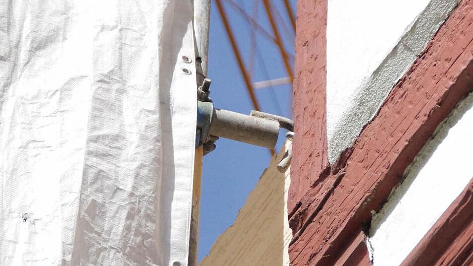 Nur ein Kran streckt seinen langen Hals über die riesige, weiße Plane vor dem Gebäude in der Amtsgerichtsstraße 10. Was hinter dem "Vorhang" geschieht, bietet Raum für Spekulationen - zumal findige Bürger einen seitlichen Spalt entdeckt haben, der einen kleinen Einblick gewährt. Und der zeigt, dass oberhalb des Erdgeschosses die Außenmauer des Gebäudes verschwunden ist.