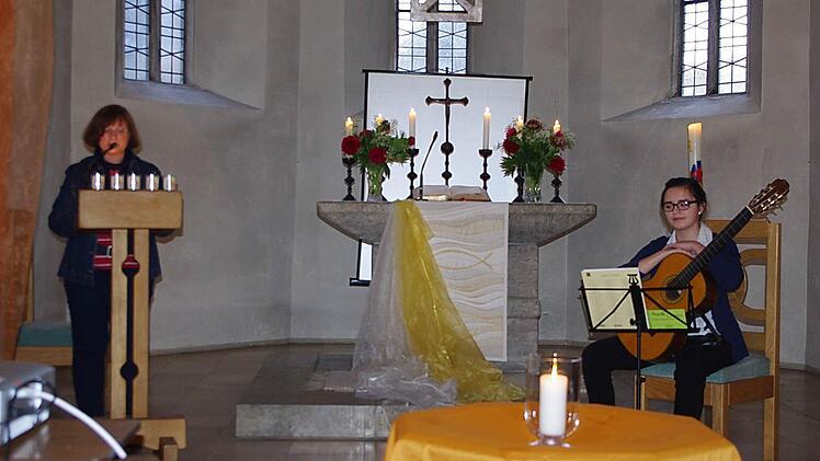 Farbige Lichteffekte an Mauerwerk und Säulen schufen eine besondere Atmosphäre in der Stadtpfarrkirche. Sie zogen die Blicke auf sich, störten aber keineswegs die Konzentration. So konnten sich die Besucher vollkommen auf das Gehörte konzentrieren.