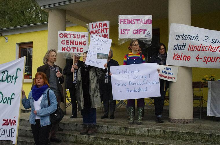 Einer nach dem anderen tröpfeln beim Kronacher Schützenhaus Männer im Sakko ein, die Aktentasche in der Hand. Auf ihrem Weg die Treppe hoch in den Saal hinein passieren sie ein Spalier aus Menschen, die auf Transparenten ihrem Ärger Luft machen. Doch diese Leute sind nicht aggressiv. Sie teilen sogar Gebäck aus, mit dem sie ein Umdenken zum Ausbau der Bundesstraßen 173 und 303 schmackhaft machen wollen. Aus Semmeln und Mohnzöpfen ragt ihre Vorstellung auf Fähnchen heraus: "Kleinere Brötchen backen - 2+1-Lösung statt Pseudo-Autobahn".