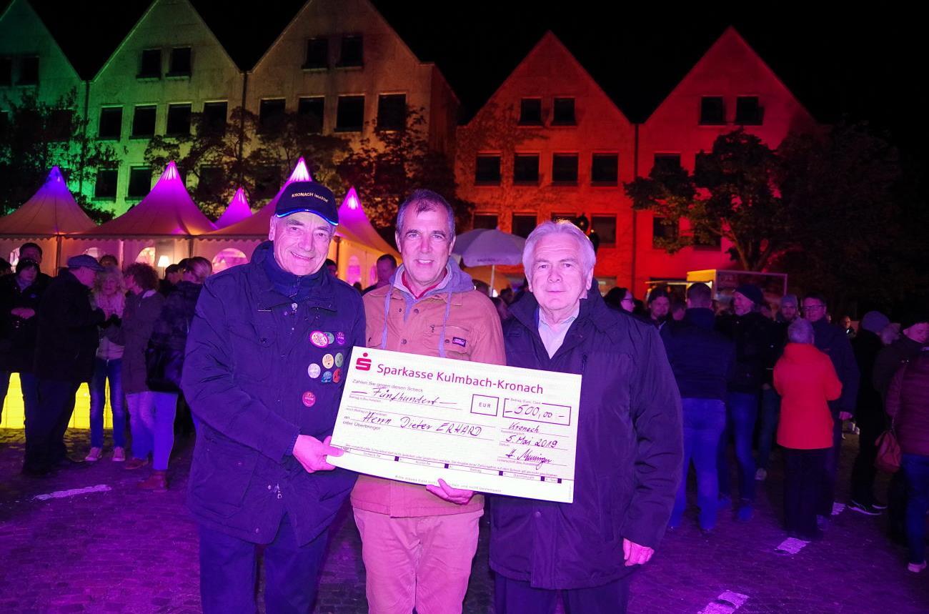 Der zauberhafte Lichtpunkt 29 "Im Anflug" ist der Gewinner des diesjährigen Publikumspreises im Wert von 500 Euro. Der von der Thüga SmartService GmbH gesponserte Preis wurde am Sonntagabend zu nächtlicher Stunde auf der großen Bühne vor dem Rathaus vergeben. Zudem durfte sich der Lichtkünstler über die "Kronach leuchtet"-Trophäe freuen, die er aus Händen von Hartmut Nenninger, Ideengeber und Verantwortlicher des Publikumspreises, erhielt.