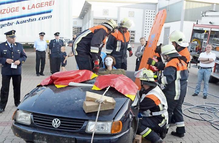 Die Feuerwehr Stockheim war bei einem simulierten Unfall und einem Brand auf dem ASS-Firmengelände im Einsatz.