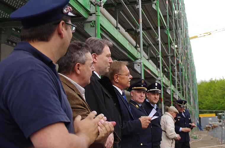 Beiergrößlein musste nur einige Minuten zurückdenken, um die Bedeutung dieses Großprojekts für die städtische Feuerwehr, aber auch für die Landkreiswehren zu erkennen. "Ein paar ältere Feuerwehrleute haben mir auf dem Weg hierher gesagt: ,Das wir diesen Tag noch erleben ...‘" Sehr lange hätten die Brandschützer warten müssen, doch inzwischen gehe es Tag für Tag mit dem Bau voran. "Dieser Neubau war seit Jahren überfällig", so Beiergrößlein.