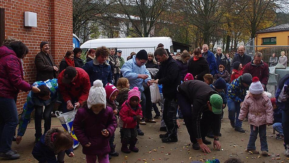 Zimmerleute hatten ein mit weißen und blauen Schleifen verziertes Richtfest-Bäumchen am Dachstuhl des Wohnheims befestigt. Tradition ist auch der vom Zimmermann auf dem Dach gesprochene Richtspruch. Diese ehrenvolle Aufgabe wurde Caroline Gehring von der Zimmerei Gehring GmbH in Stadtsteinach zuteil. Der Bonbonregen fand unter den Jungen und Mädchen - überwiegend der Lebenshilfe und des Kreuzberg-Kindergartens - viele dankbare Abnehmer. Bestens ausgerüstet mit großen Tüten hatten diese bereits voller Ungeduld ausgeharrt.