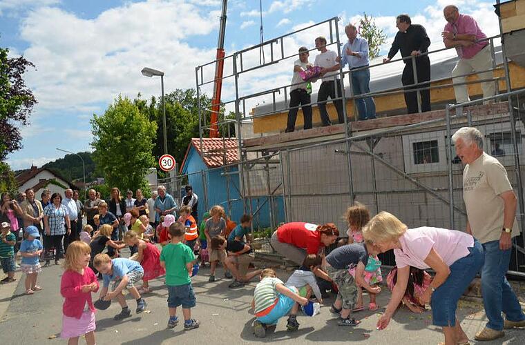 Die Handwerker lieferten schon bisher eine gute Arbeit ab. Das bestätigte Zimmerermeister Günther Stenglein aus Mainleus in seinem Richtspruch hoch vom Gerüst herab zu den Eltern und Kinder sowie zahlreichen Ehrengästen. Die Kinder waren gespannt, denn sie wussten, sobald oben angestoßen und auf ein weiteres gutes Gelingen der Baumaßnahme ein Schluck getrunken wird, würde es Süßigkeiten regnen.