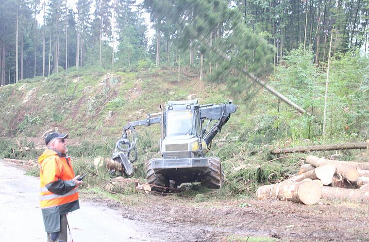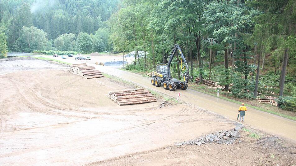 Mit einem Forwarder, einem Rückezug, der auch in unwegsamem Gelände eingesetzt werden kann, werden die Fixlängen zum Lagerplatz zwischen Kremnitzbrücke und Felsnase gebracht. Dort haben Baumaschinen die Humusschicht weggeschoben und zu einen kleinen Berg aufgetürmt. Nicht nur die Stämme der Staatsforsten werden auf dieser geräumten Fläche gelagert, auch Aushubmaterial. Das wird später wieder verfüllt, der Humus auf der Wiese wieder breit geschoben. Die Fixlängen werden nach und nach abtransportiert, weil sehr große Holzmengen anfallen. Forstwirtschaftsmeister Georg Scherbel, der den Einsatz leitet, rechnet damit, dass auf der eineinhalb Hektar großen Fläche mehr als 350 Festmeter Fixlängen anfallen.