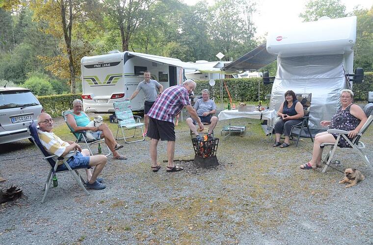 Ein Camper aus Stuttgart ist zum ersten Mal hier und fühlt sich wohl. Das Einzige, was ihm fehlt, sind Internet und Mobilfunk, aber ansonsten zeigt er sich zufrieden, vor allem mit der beschaulichen Lage. Ein paar Plätze weiter entdecken wir echte Lagerfeuerromantik. Um die knisternden Flammen im Feuerkorb haben es sich mehrere Personen beim Bier gemütlich gemacht. Es stellt sich heraus, dass sie aus Berlin, Humprechtshausen und dem Ahrtal kommen.